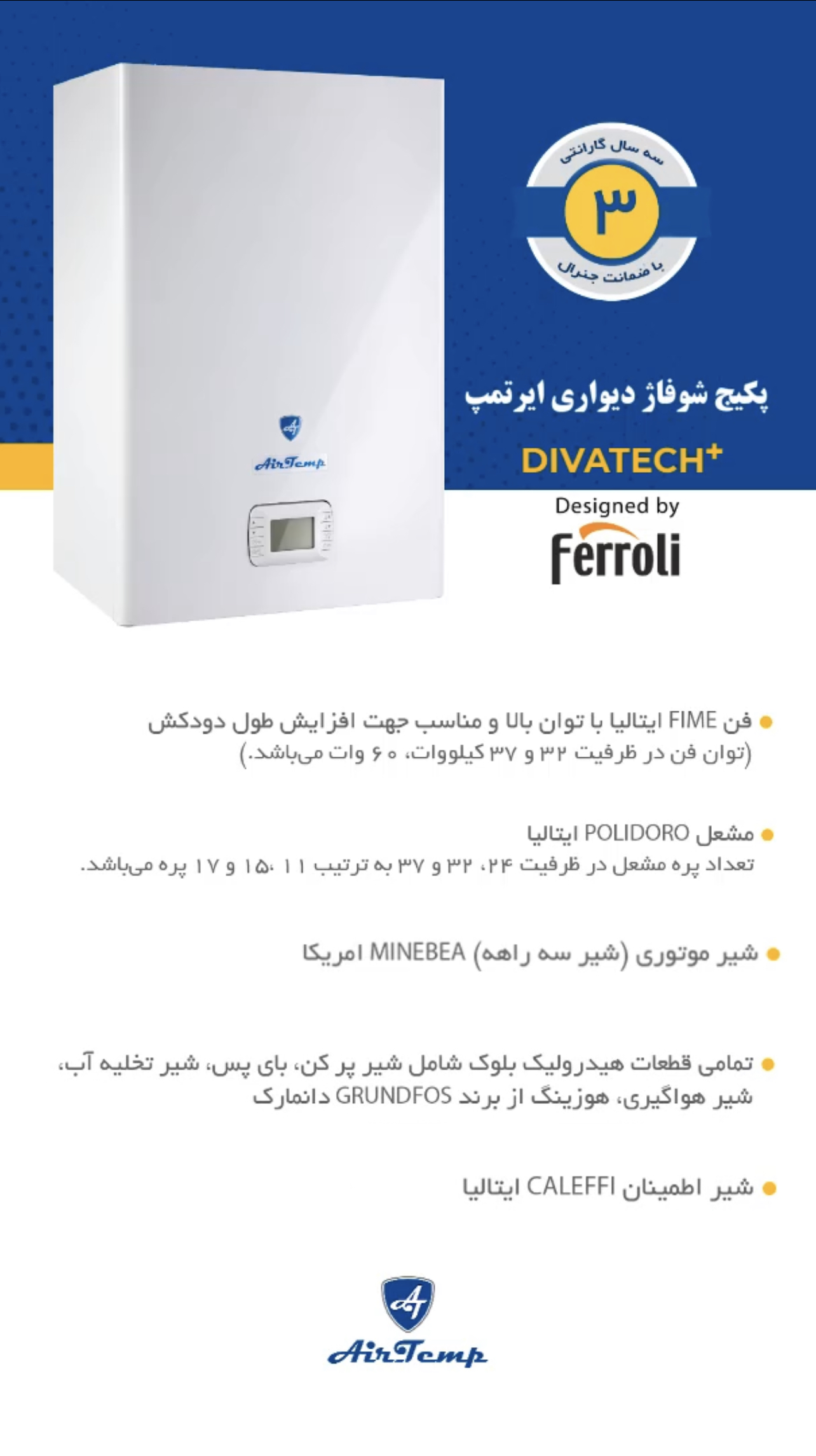 پکیج شوفاژ دیواری ایرتمپ 32 هزار RSI فرولی . دومبدل / دیجیتال / فندار / قطعات کلا ایتالیا